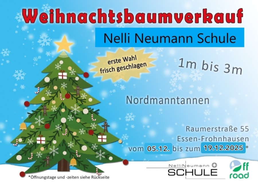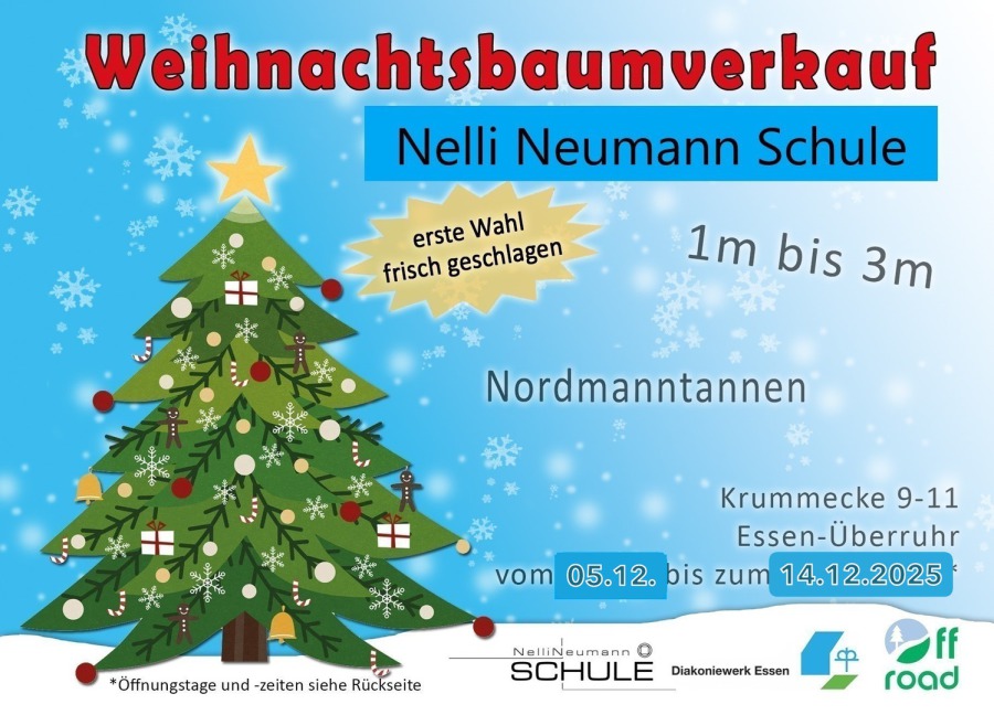 Der Weihnachtsbaum wird wie jedes Jahr durch unsere Lerngruppe Offroad durchgeführt. Vom Verteilen der Flyer, über den Transport der Bäume aus dem Sauerland nach Essen, bis zum Verkauf der Bäume und der Auslieferung zu den Kunden übernehmen unsere Schüler alle Aufgaben.